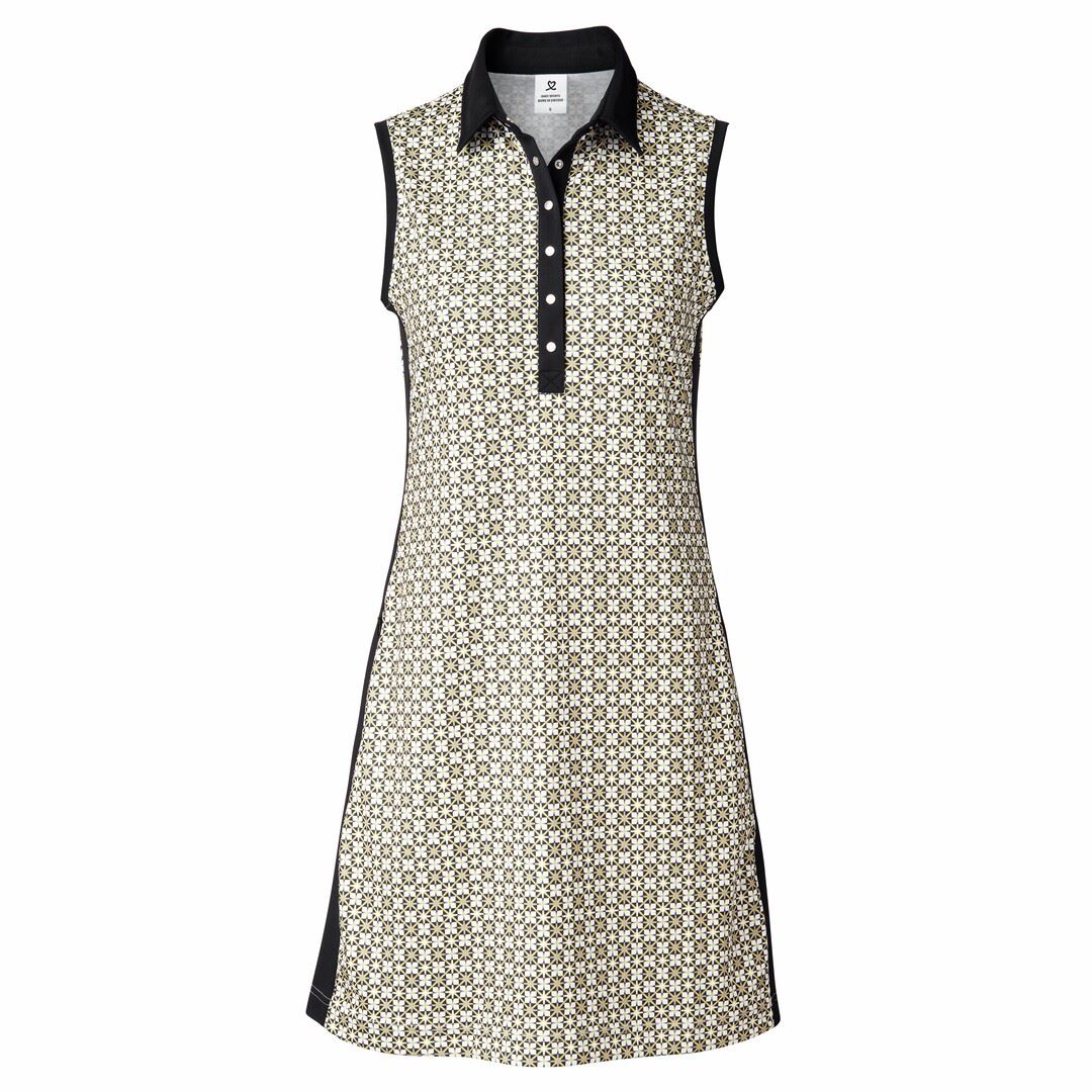 Kleid ohne Arm Schnell trocknendes Stretchmaterial Allover bedruckt Nieten vorne Schwarze Einsätze an den Seiten