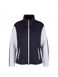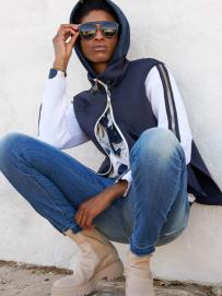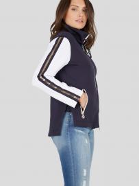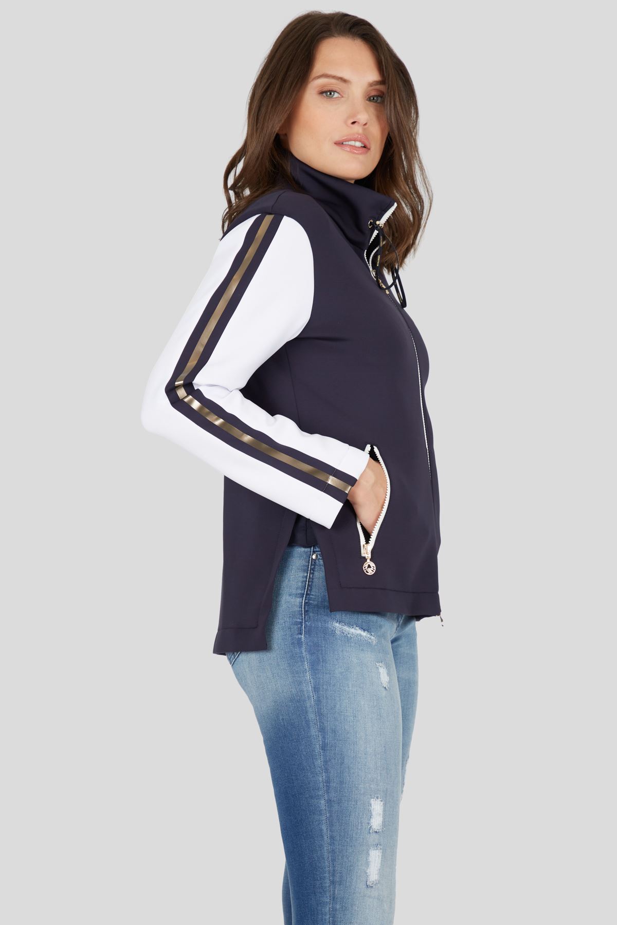 Im entspannten Casual-Look präsentiert sich diese modische Jerseyjacke. Durch die überschnittene Schulter und den legeren Schnitt erhält die Jacke eine trendy Silhouette. Abgerundet wird das Ganze durch den weiten Kragen, dessen Kordel und Kordelstopper nur zur Zierde angebracht sind. In den Seiten sind kurze Schlitze eingearbeitet und der Saum im Rückenteil ist etwas länger als im Vorderteil. Für den Reißverschluss und die leicht schräg eingearbeiteten Reißverschlusstaschen im Vorderteil wurden Aquaguard-Reißverschlüssen verwendet. Die modische Transfer-Technik wurde bei den Längsstreifen am Ärmel und für den Metallic-Logo-Schriftzug am Rückenteil angewendet.