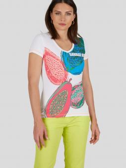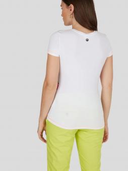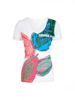 Der Sommer lässt grüßen! Dieses Kurzarmshirt mit dem mehrfarbigen Kollektionsdruck ist ein Blickfang. Der Druck am Vorderteil ist mit einem tonigen Glitterprint kombiniert und das Shirt erhält dadurch einen angenehmen Glitzereffekt. Die neonfarbigen Flatlocknähte zieren die Säume und den Ausschnitt. Der V-Ausschnitt und die schmale Schnittform betonen die weibliche Silhouette. In der Rückenmitte ist ein hochwertiges Sportalm-Logo platziert.