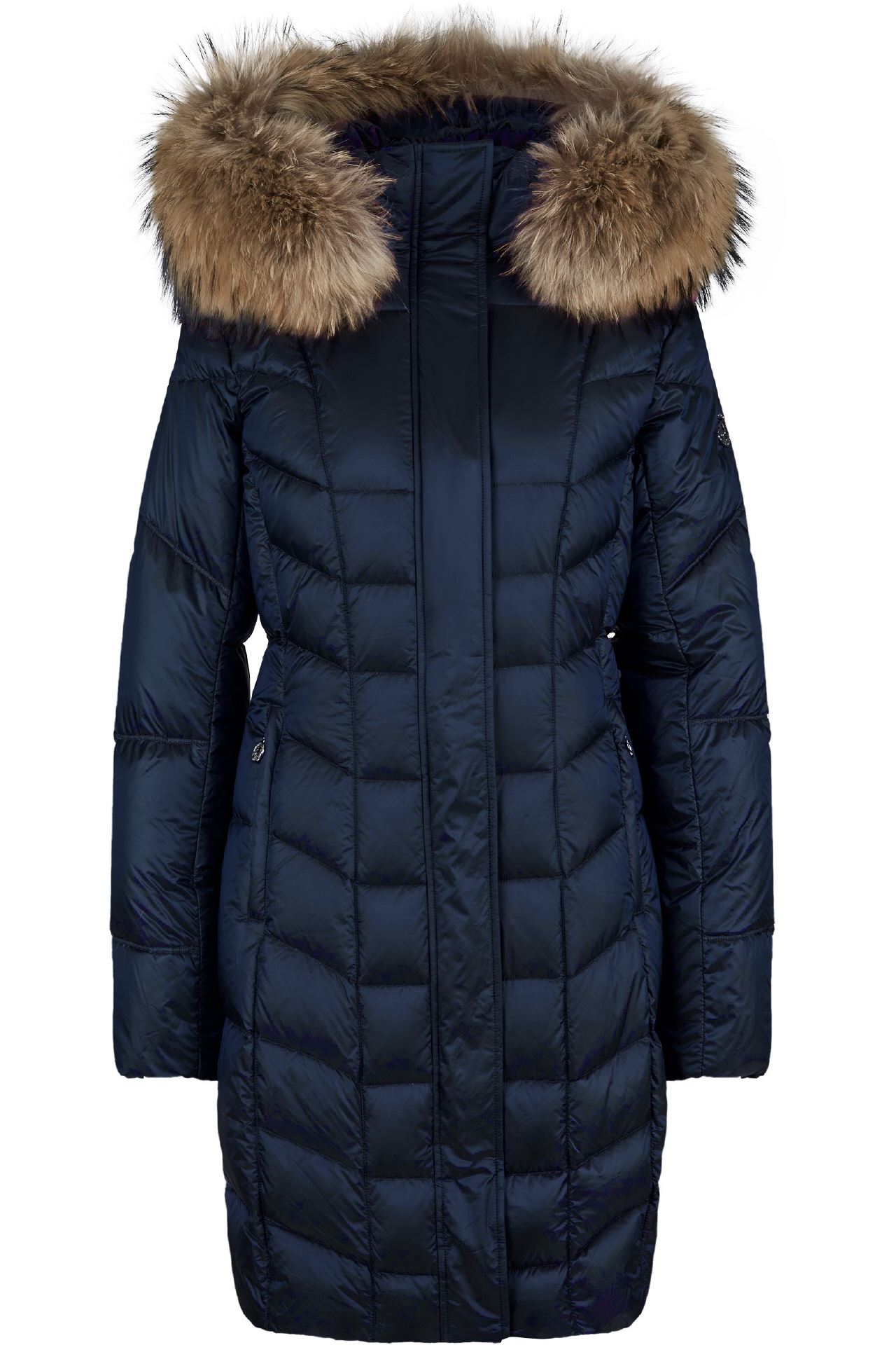 Ein Schmuckstück in weißer Winterlandschaft ist dieser elegante, lässige Daunenmantel aus superwarmer weicher 80/20 Enten Daunenfüllung. Schön anzusehen sind die Längs- und Querstepps die den Mantel überziehen. Praktisch zeigen sich die seitlichen Leistentaschen mit Reißverschlüssen sowie eine abzippbare Kapuze mit einem separat abnehmbaren Echtpelzkragen (Finnraccoon) und Windfangbündchen aus Fleece an den Ärmeln. Ein kleiner Logostick am Ärmel unterstreicht den eleganten Touch dieses wunderbaren Sportalm Daunenmantels.