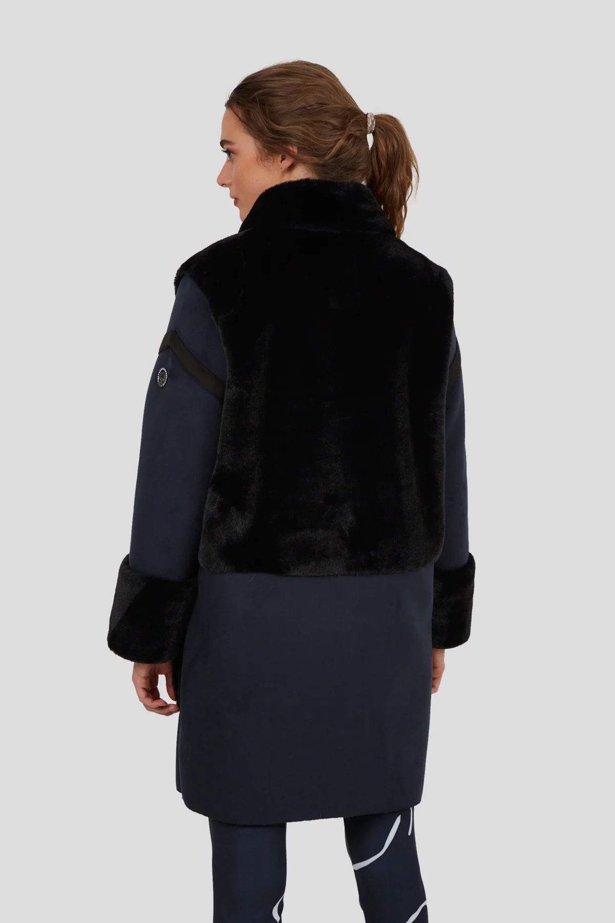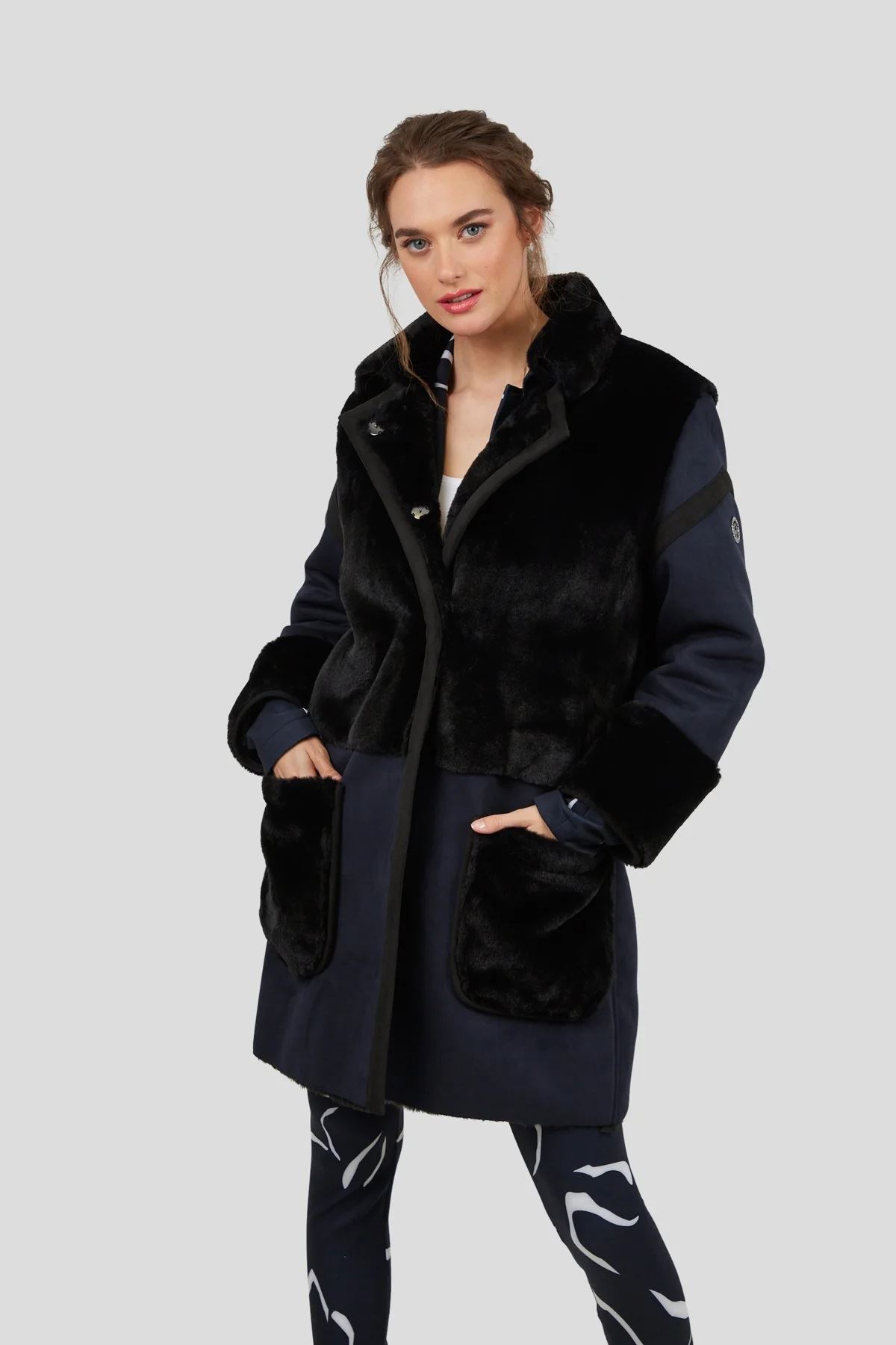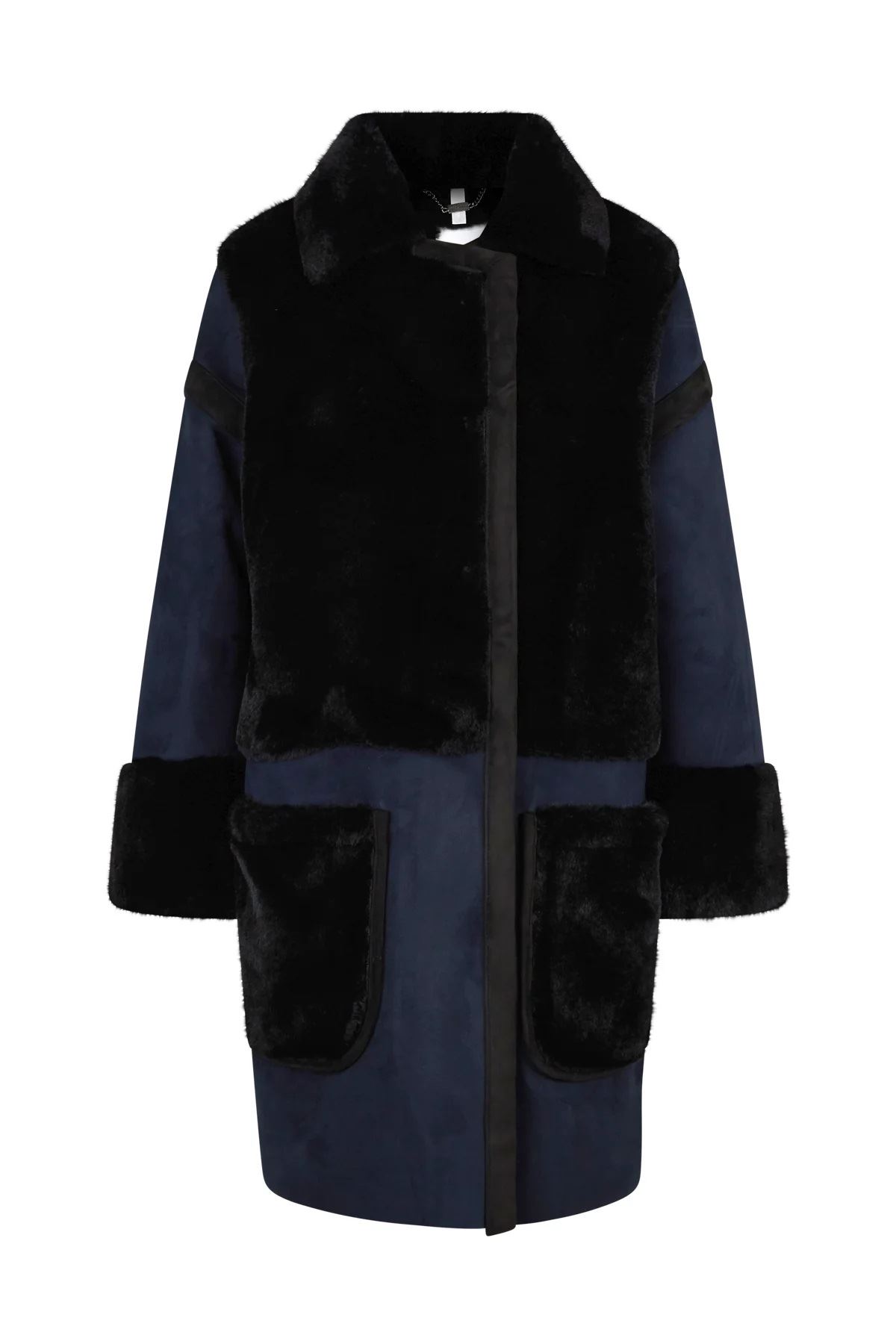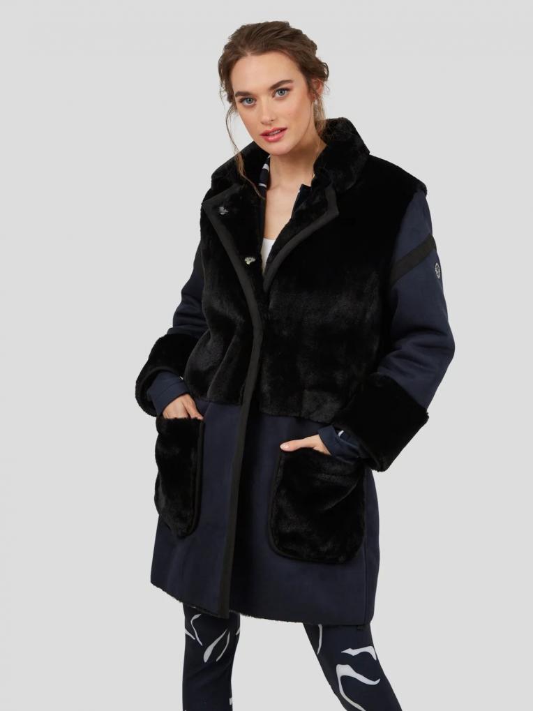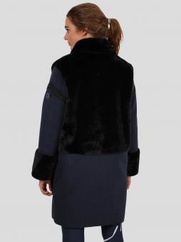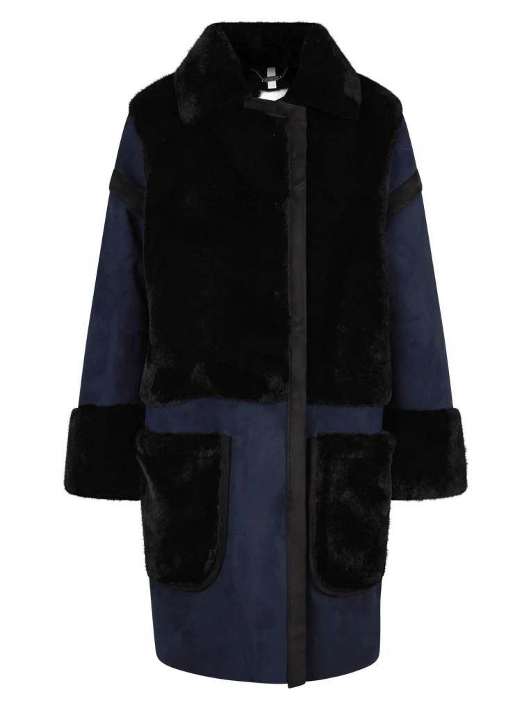 Dieser Mantel zeichnet sich durch das hochwertige Material aus. Die verwendete Ware stellt ein Lammfell nach. Dreht man die Ware, ist die Rückseite aus einem schönem Lederimitat. Bei diesem Mantel wird mit beiden Warenseiten gearbeitet und ergeben dadurch einen edlen Wintermantel. Die offenen Kanten werden mit einem Fake Leder eingefasst. Aufgesetzte Taschen bieten genügend Platz, um Kleinigkeiten zu verstauen und um die Hände warm zu halten. Als Verschluss wurden verdeckte Druckknöpfe in der vorderen Mitte angenäht, welche ein einfaches Schließen vom Saum bis zum kleinen Kragen ermöglichen. Lederstreifen und eine Logo Niete am Ärmel komplettieren den Look. Durch die Farbkombination von schwarz und blau wirkt der ungefütterte Mantel neu, jung und modern.