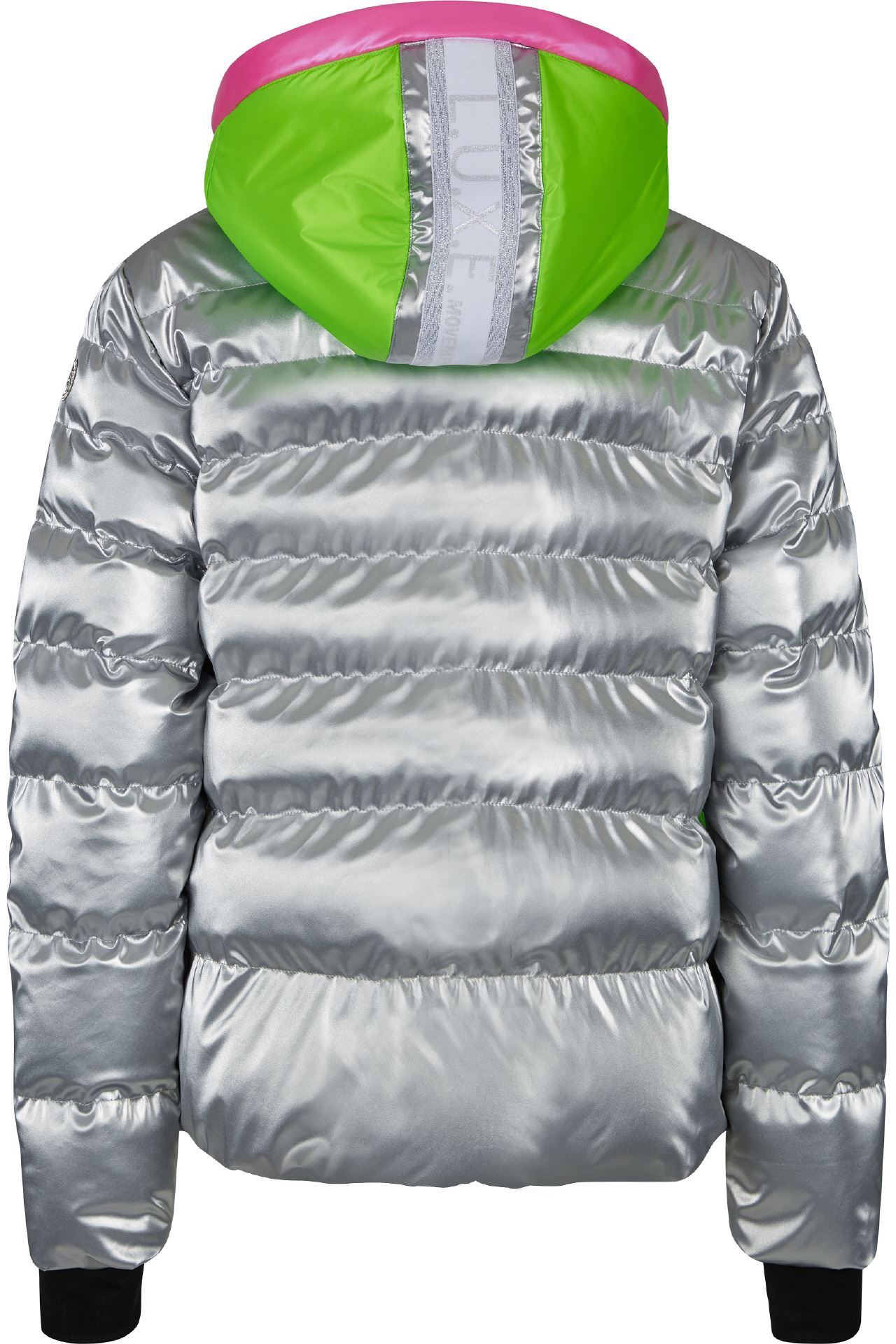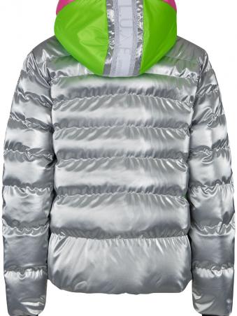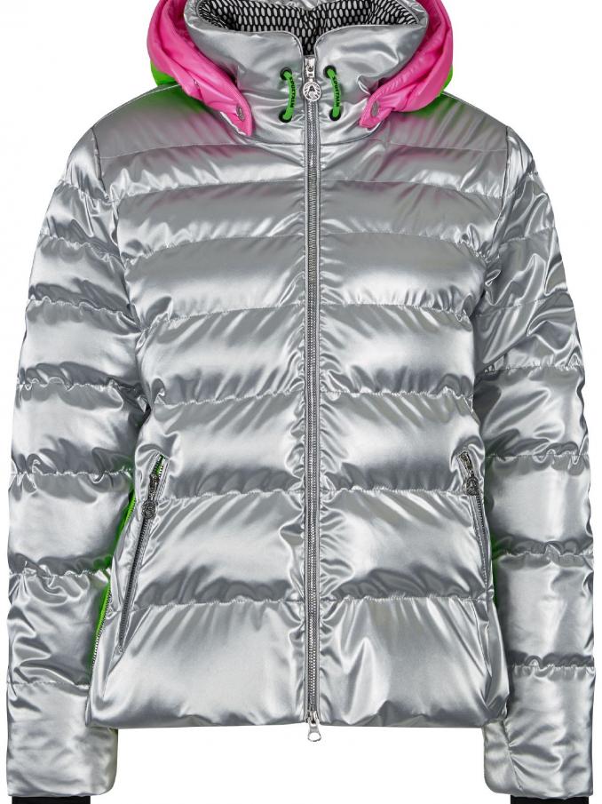 Modische Daunenskijacke im Silver Design. Der Kragen ist innen mit Netzfutterabgesetzt und die Kapuze ist abnehmbar.