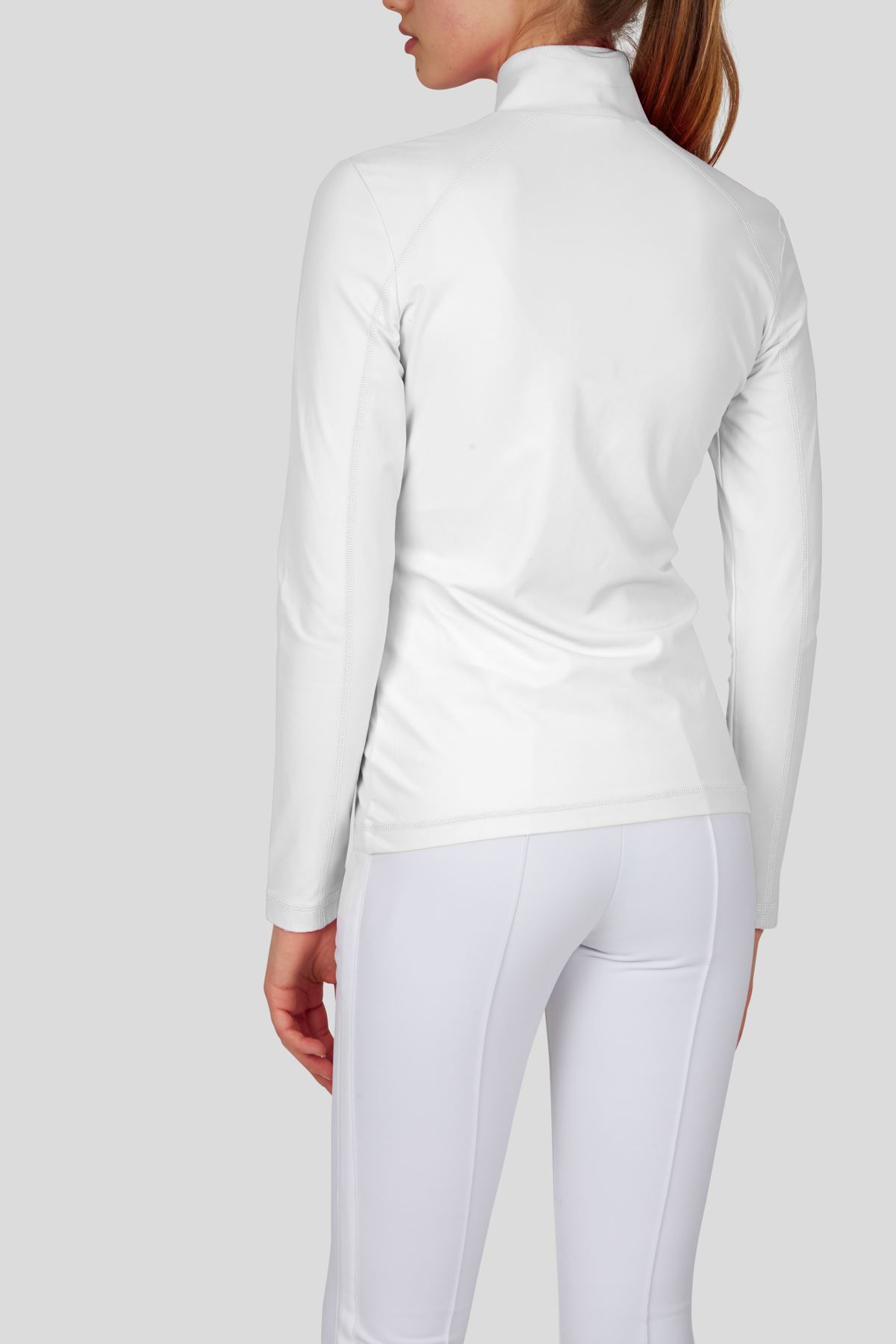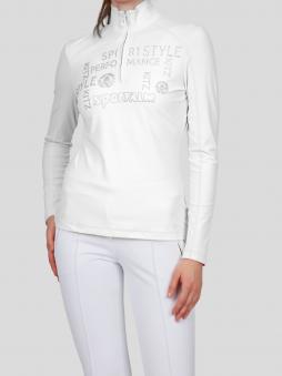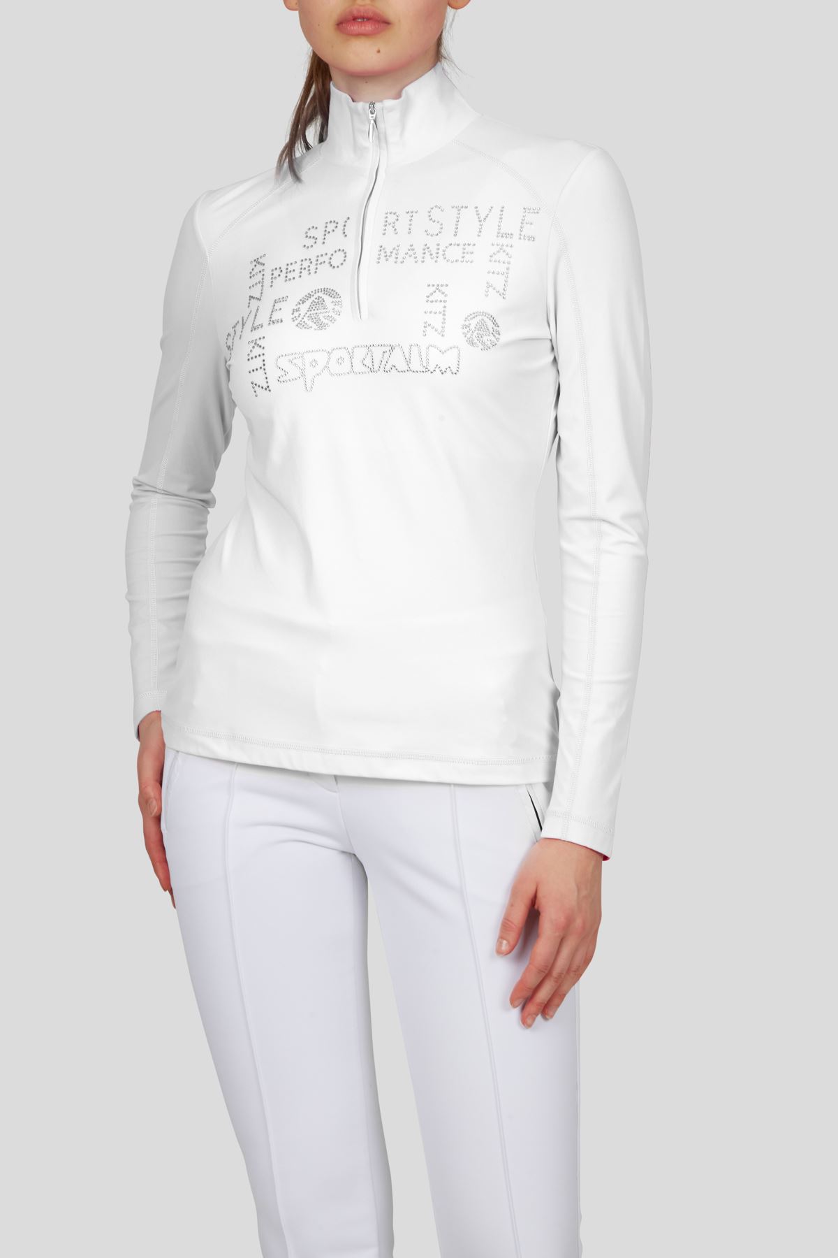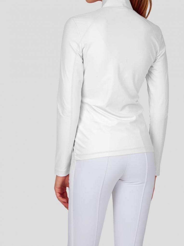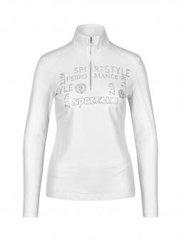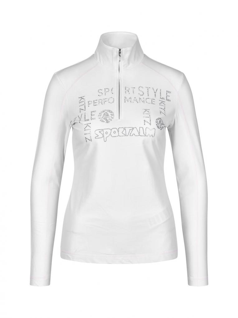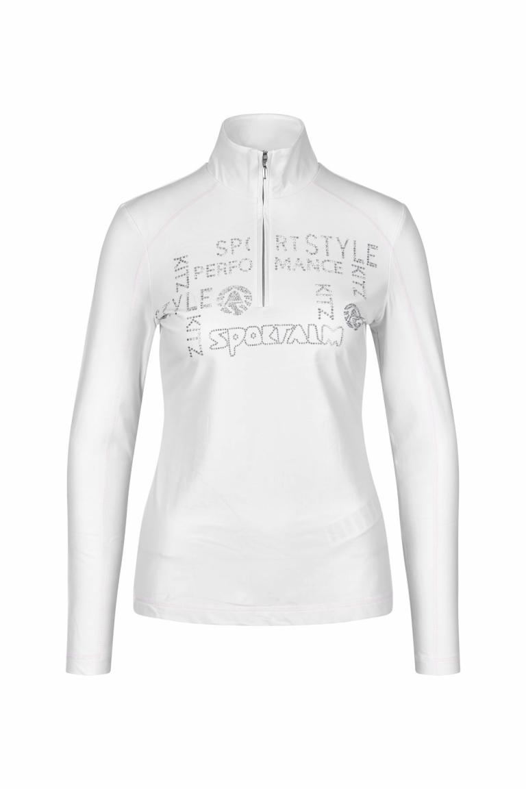 Tailliert geschnitten schmiegt sich dieser figurumschmeichelnde Unterzieher mit Stehkragen und Reißverschluß wie eine zweite Haut an. Ein am Vorderteil platziertes Strassmotiv sowie Flatlocks in Kontrastfarbe ziehen Blicke auf sich.