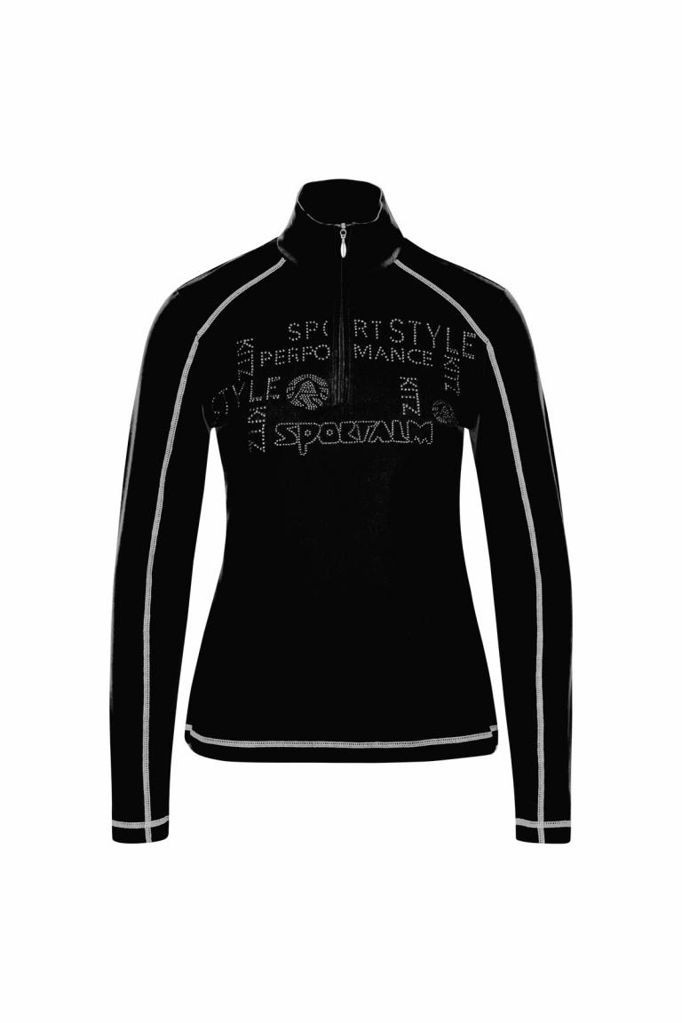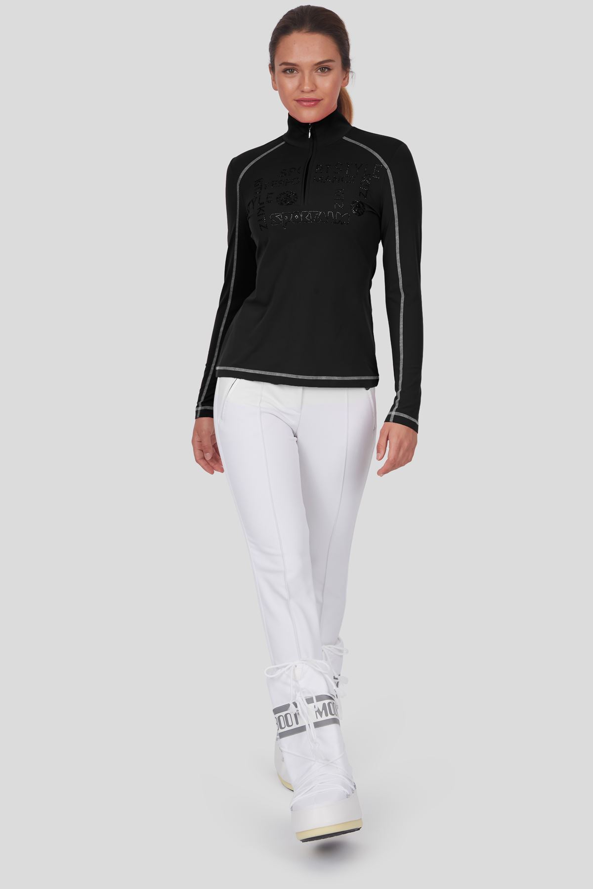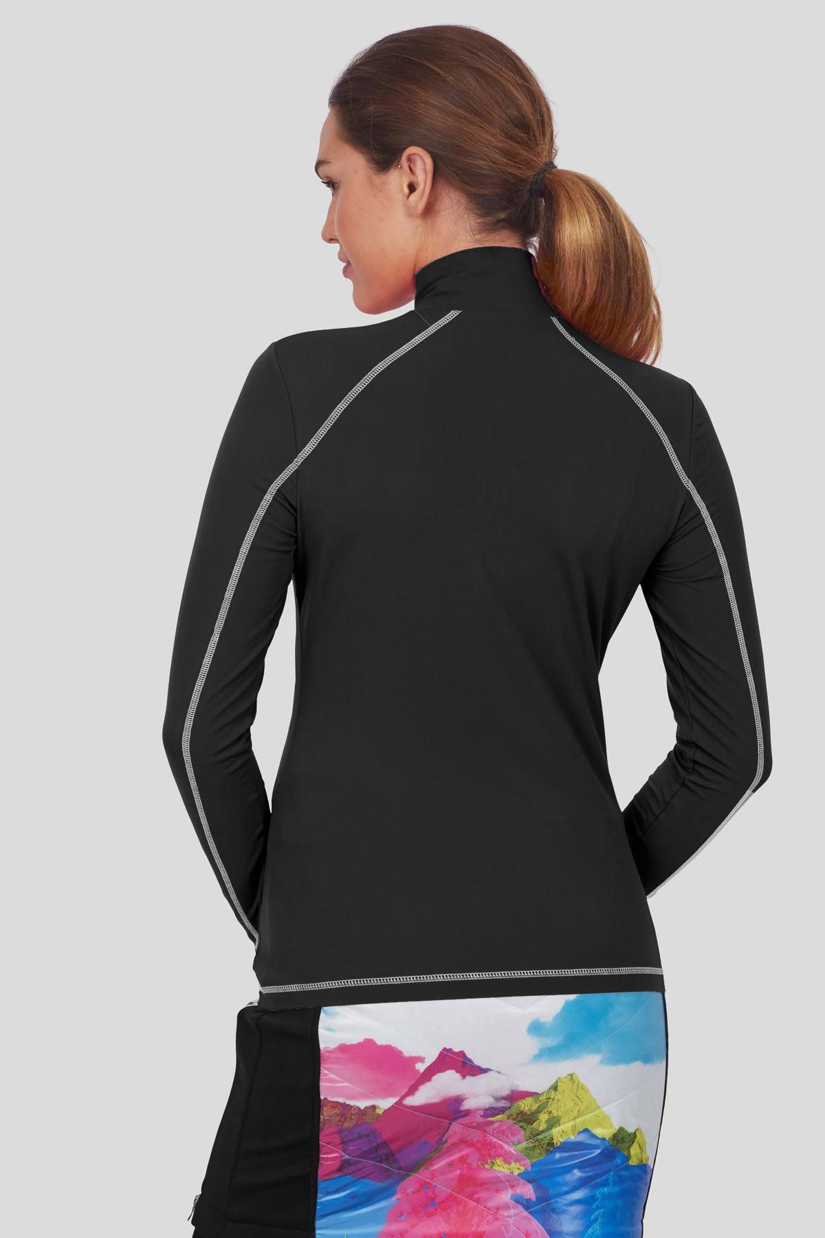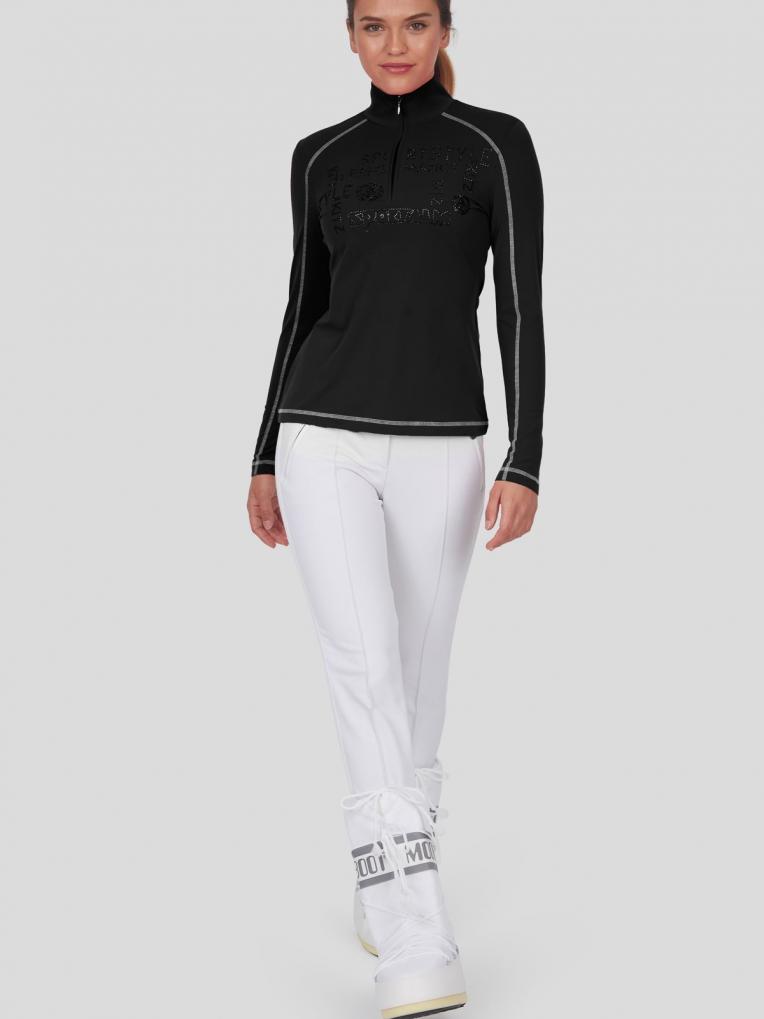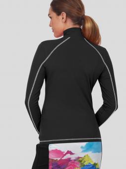 Tailliert geschnitten schmiegt sich dieser figurumschmeichelnde Unterzieher mit Stehkragen und Reißverschluß wie eine zweite Haut an. Ein am Vorderteil platziertes Strassmotiv sowie Flatlocks in Kontrastfarbe ziehen Blicke auf sich.
