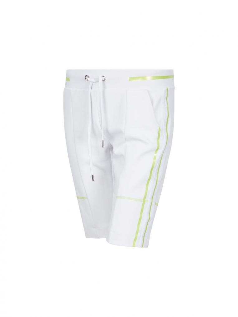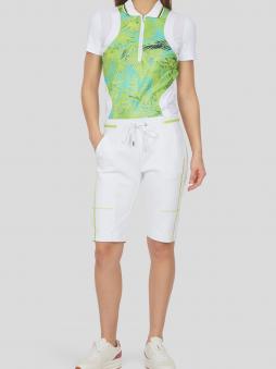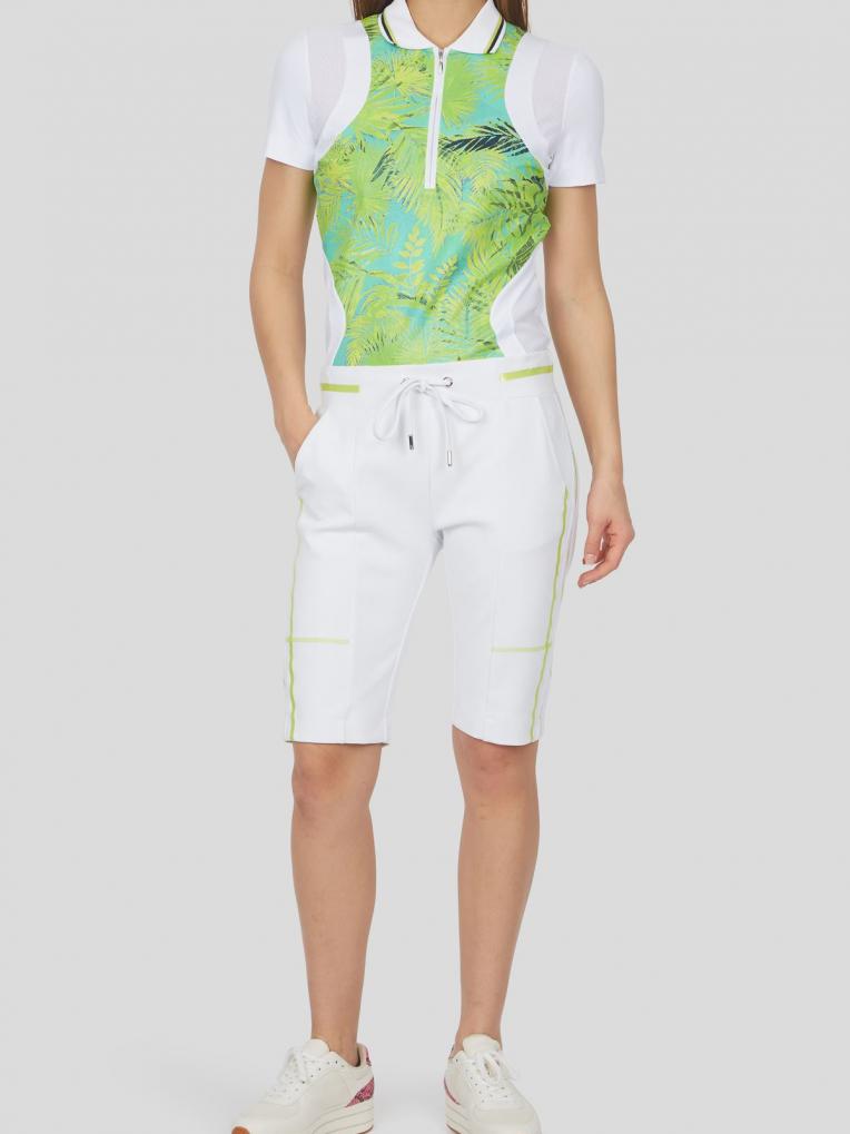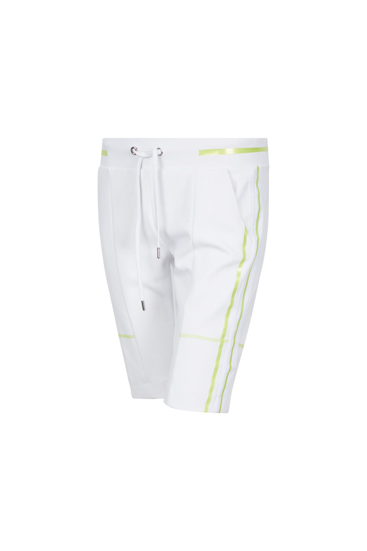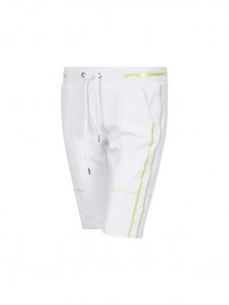 Im entspannten Casual Look präsentiert sich diese Golf-Shorts aus unifarbener Scuba-Jersey-Qualität. Ein Hingucker ist der angesetzte Bund versehen mit Metallic-Tape Streifen. Am Bund zeigt sich lässig ein verstellbarer Tunnelzug mit Kordelband.