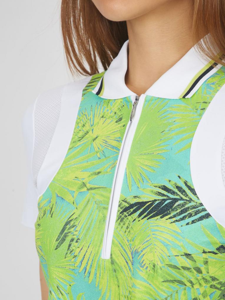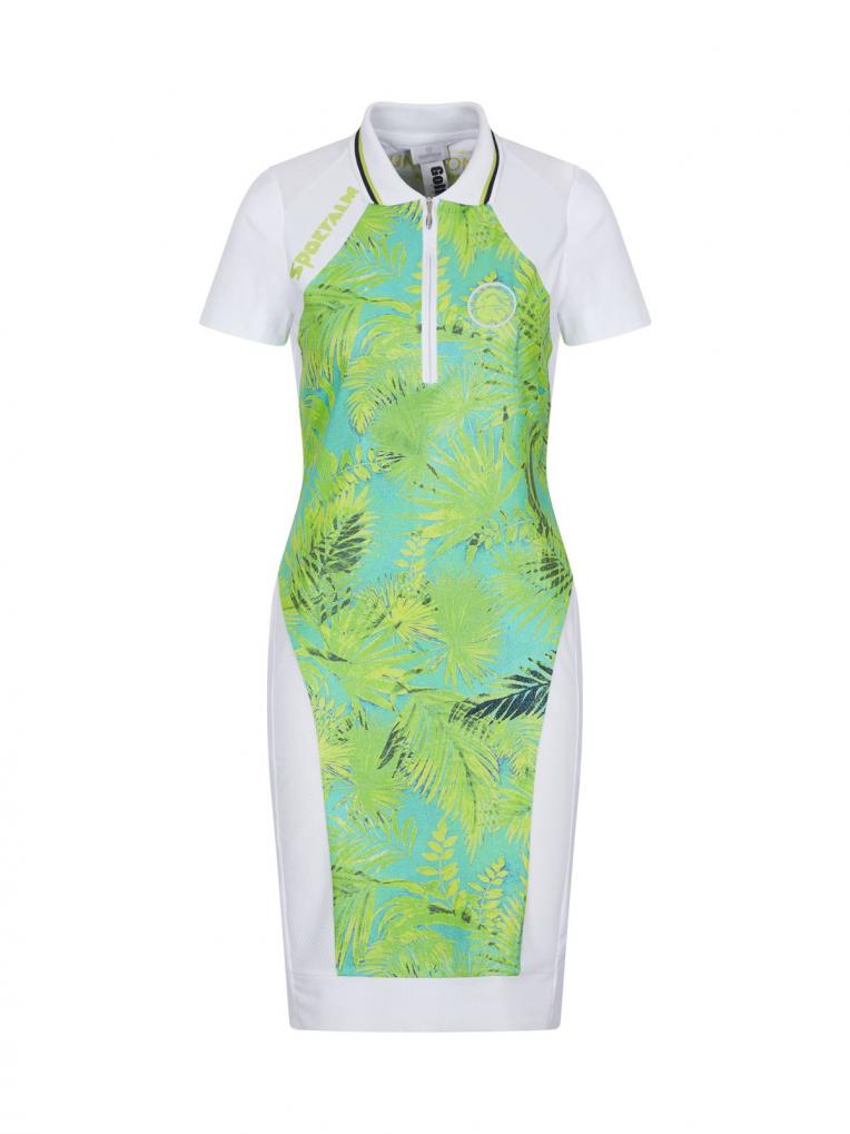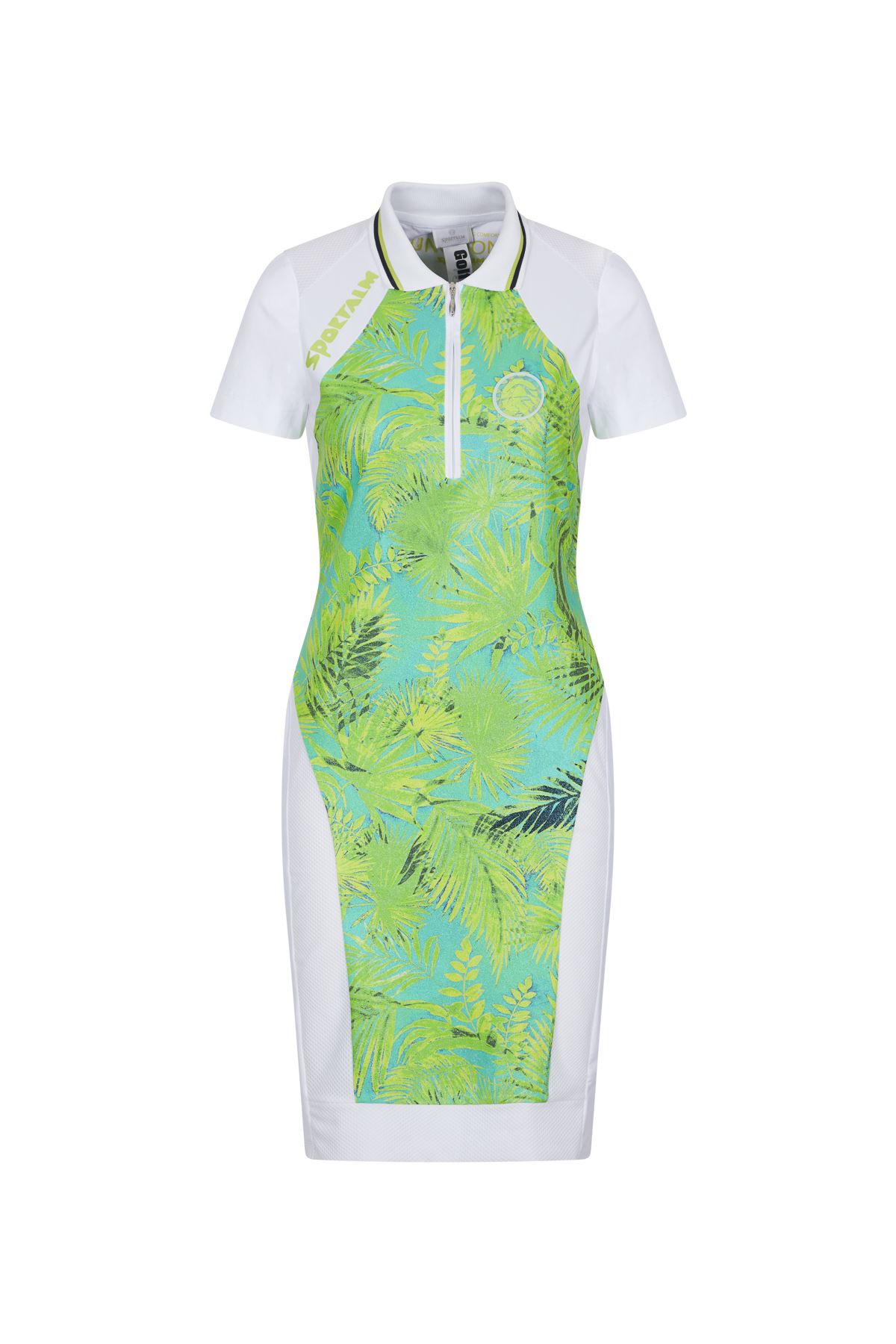 Ein Hingucker ist dieses reizvolles, taillierte Golfkleid mit Strickkragen aus edler Piquee-Ware. In schlanker Silhouette geschnitten sorgt es für einen stilsicheren Auftritt für jede Golferin. Ein sommerlicher Palmendruck, lässige Details wie der Folienprint-Schriftzug am Vorderteil sowie glitzerndes Lurex-Garn ziehen Blicke nach sich. Seitliche Einsätze aus strukturiertem Jersey und Netzqualität runden das edle Design frühlinghaft ab.