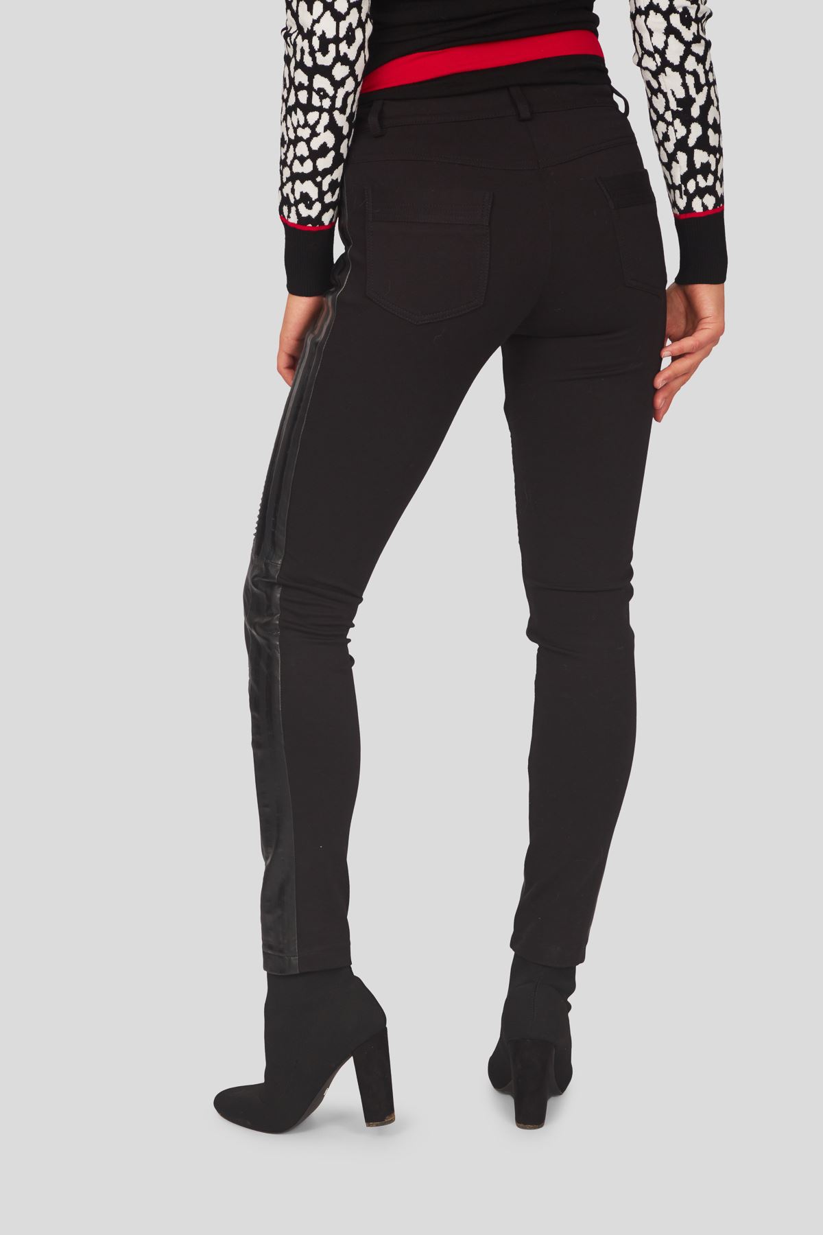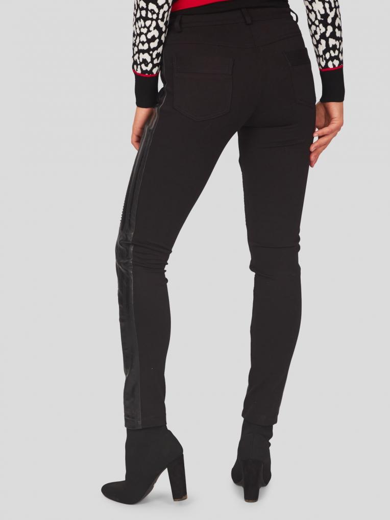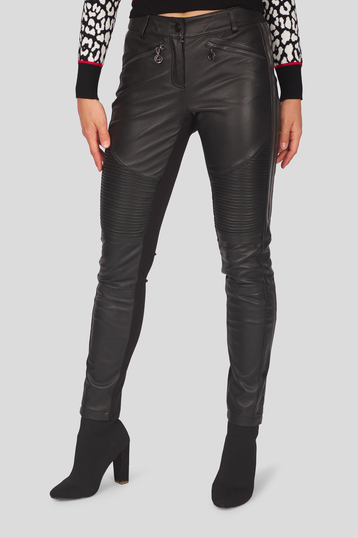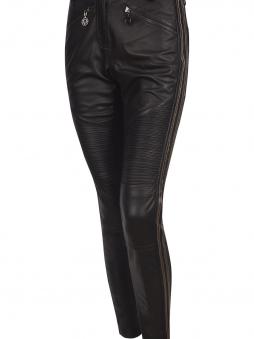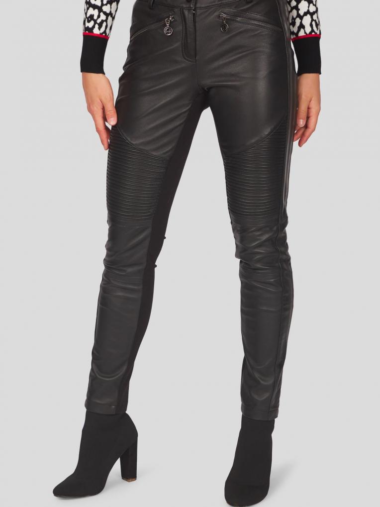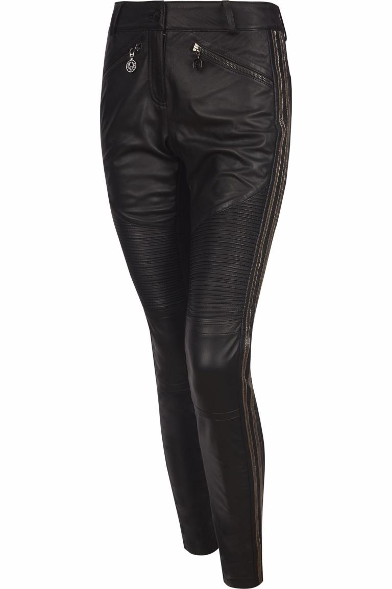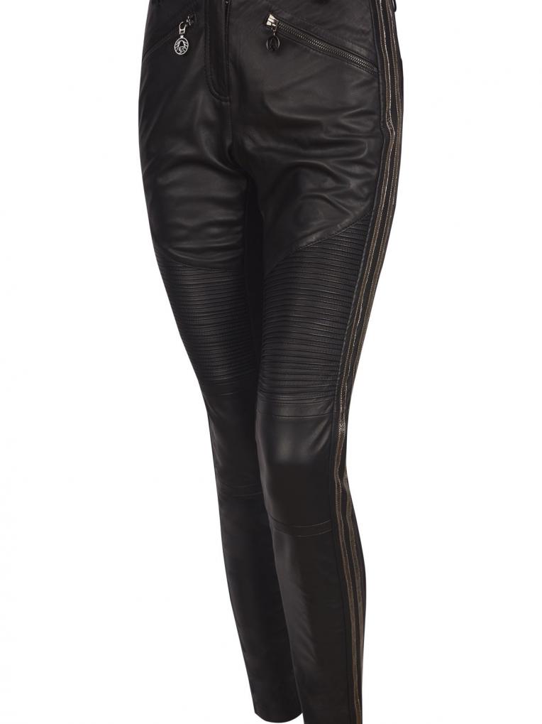 Figurbetonte, unifarbene Hose aus Nappa Leder Qualität an der Vorderhose und angenehmer Jersey-Qualität an der Hinterhose. Edle Details wie moderne Absteppungen am Hosenbein sowie eingesetzte Streifen in der Seitennaht ziehen Blicke nach sich. Aufgesetzte Gesäßtaschen und schräge Reißverschlusstaschen am Vorderteil verprechen einen lässigen Look.