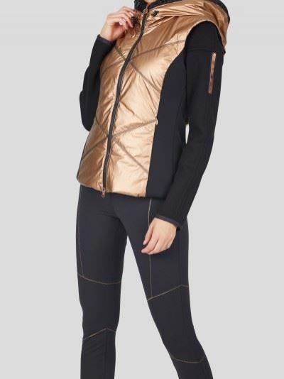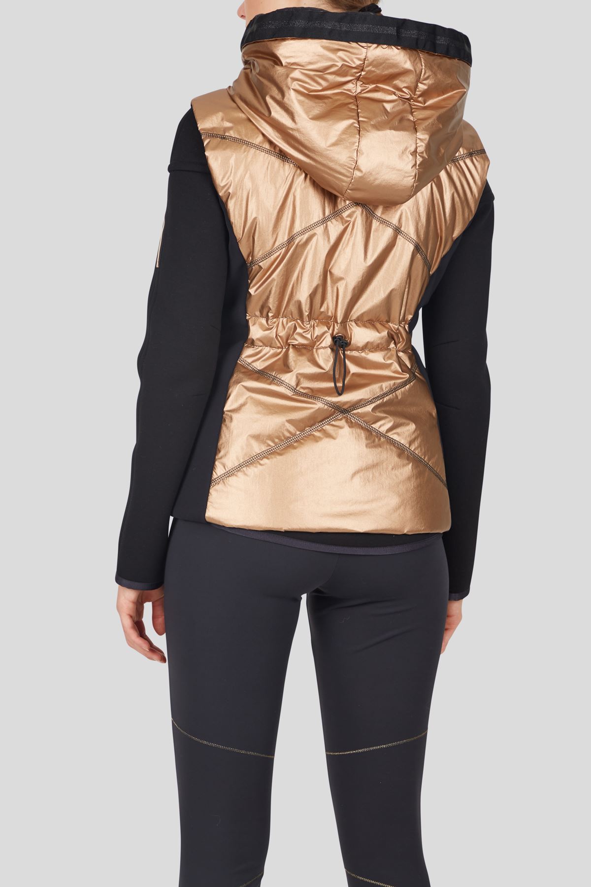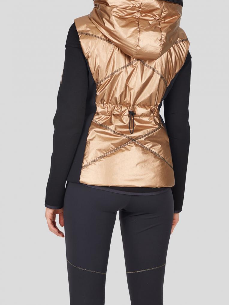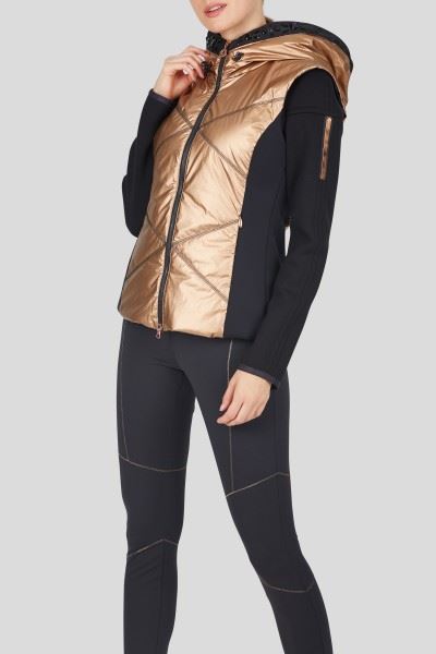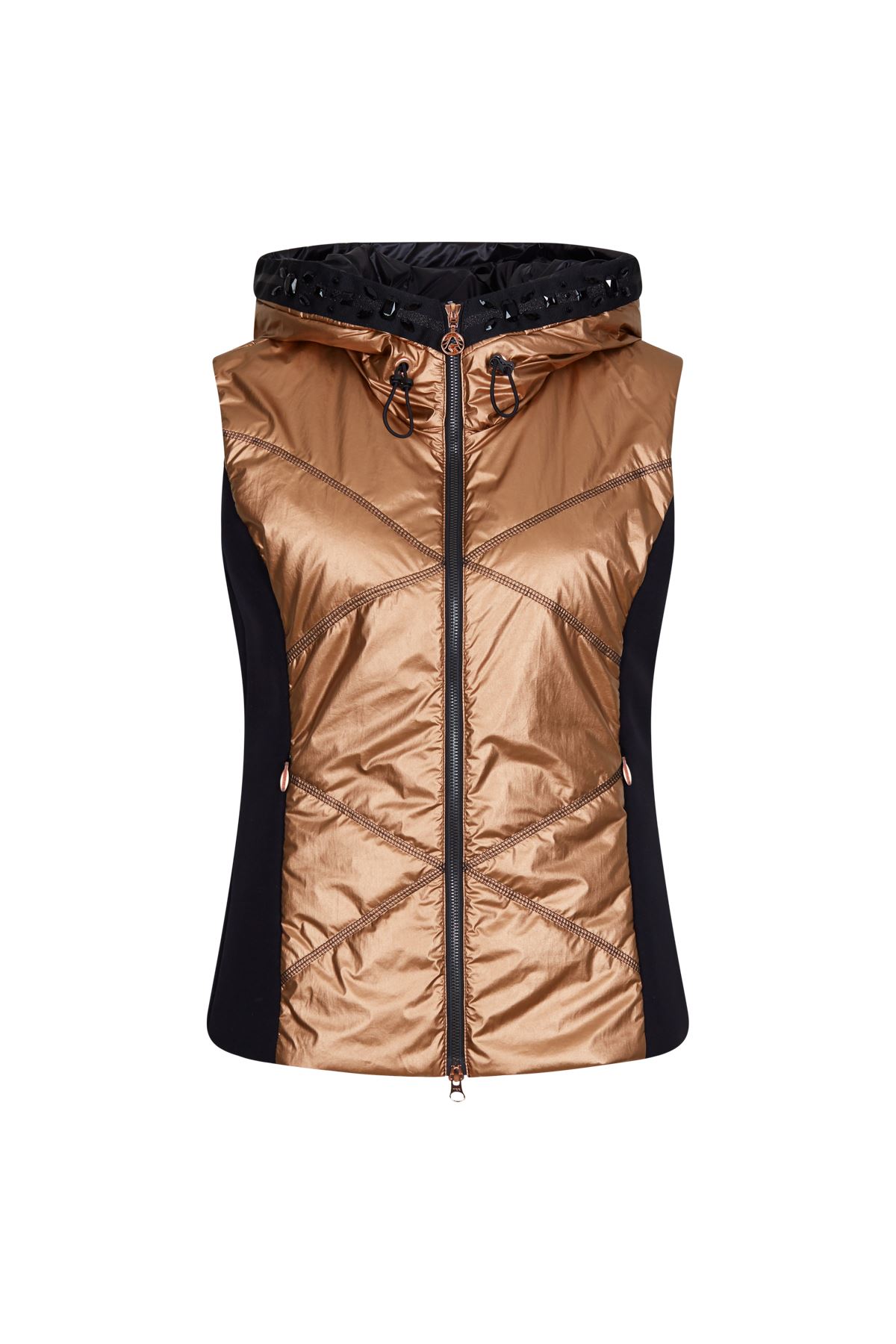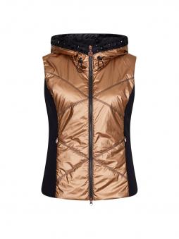 Mit dieser leichten, wattierten Weste aus Nylon-Qualität mit ausladender Kapuze und Tunnelzug sind Sie für kühle Wetterkapriolen perfekt gerüstet. Seitliche Einsätze aus elastischer Jersey Ware in Kontrast versprechen einen angenehmen Tragekomfort. Edle Details wie Flat- Locknähte zur Zierde, sowie ein schmückendes Strassband am Kapuzenrand ziehen Blicke nach sich. Praktisch zeigt sich rückwärts ein Tunnel mit Kordelzug. Nahttaschen machen Platz für Kleinigkeiten.