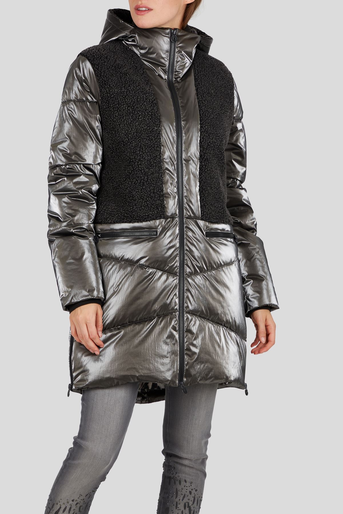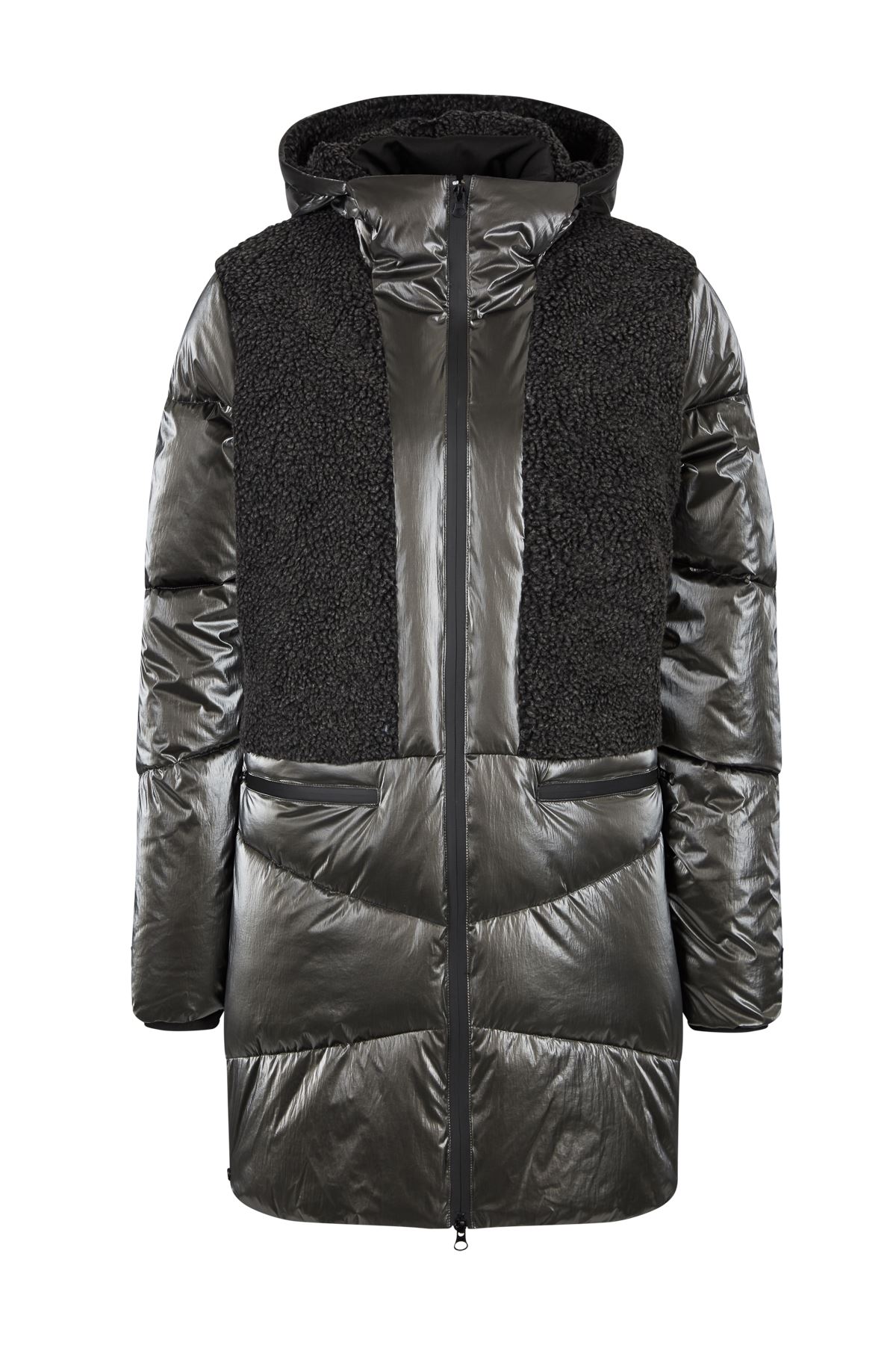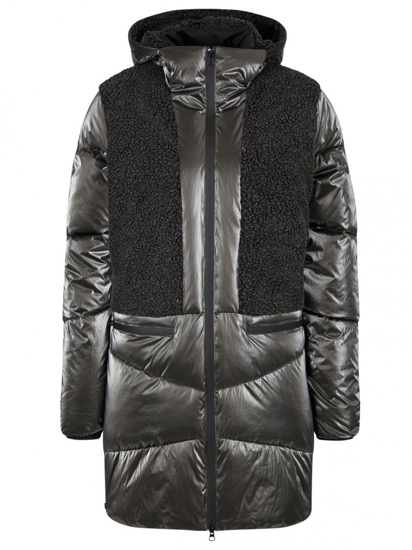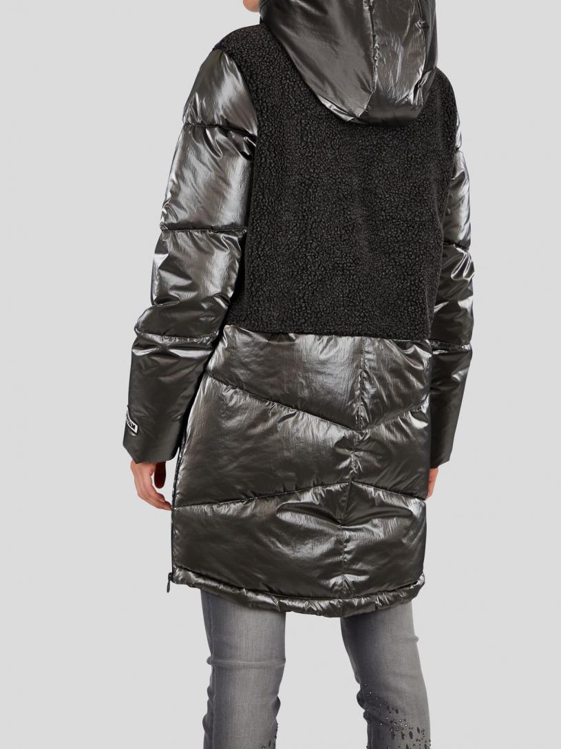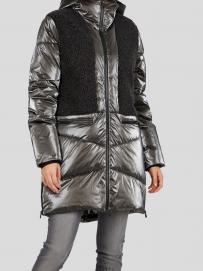 Der Outdoormantel mit einer großen Kapuze aus Metallicnylon und Fake-Fur Einsätzen, hat eine modische Form mit leichter A-Linie und abgesteppter Wattierung. Der Kragen und die Ärmelbündchen sind aus elastischer Scubaware. Praktisch wird der Mantel mit einem Zwei-Wege-Aquaguard-Zipp in der vorderen Mitte geschlossen. Die Aquaguardzipps an den Taschen im Vorderteil und an den seitlichen Schlitzen und einem SPORTALM-Etikett am linken unteren Ärmel verleihen einen sportiven Look.