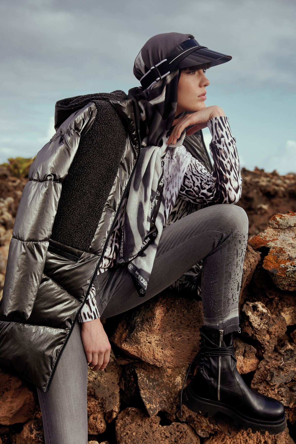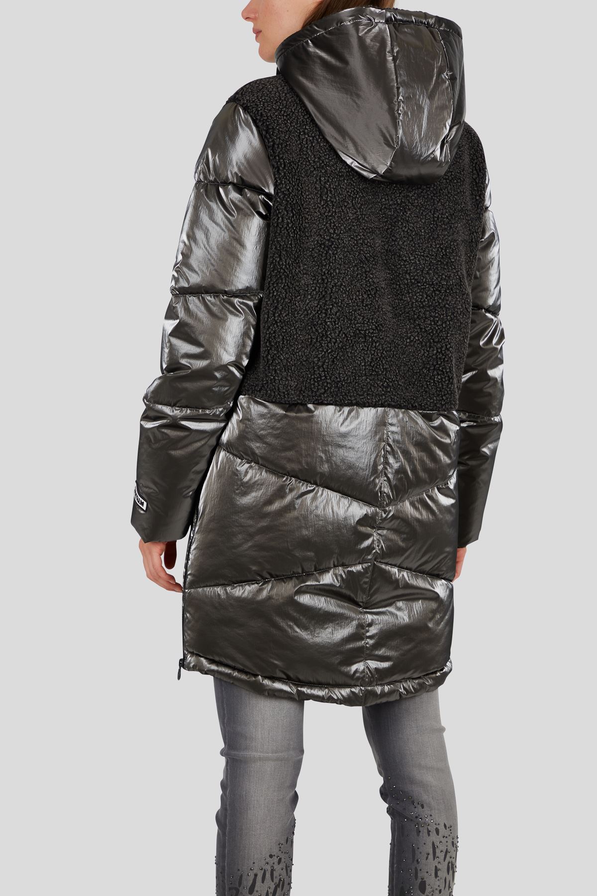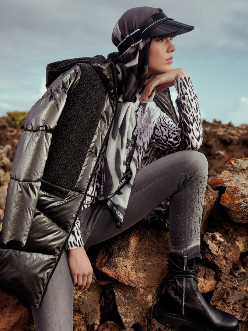 Der Outdoormantel mit einer großen Kapuze aus Metallicnylon und Fake-Fur Einsätzen, hat eine modische Form mit leichter A-Linie und abgesteppter Wattierung. Der Kragen und die Ärmelbündchen sind aus elastischer Scubaware. Praktisch wird der Mantel mit einem Zwei-Wege-Aquaguard-Zipp in der vorderen Mitte geschlossen. Die Aquaguardzipps an den Taschen im Vorderteil und an den seitlichen Schlitzen und einem SPORTALM-Etikett am linken unteren Ärmel verleihen einen sportiven Look.