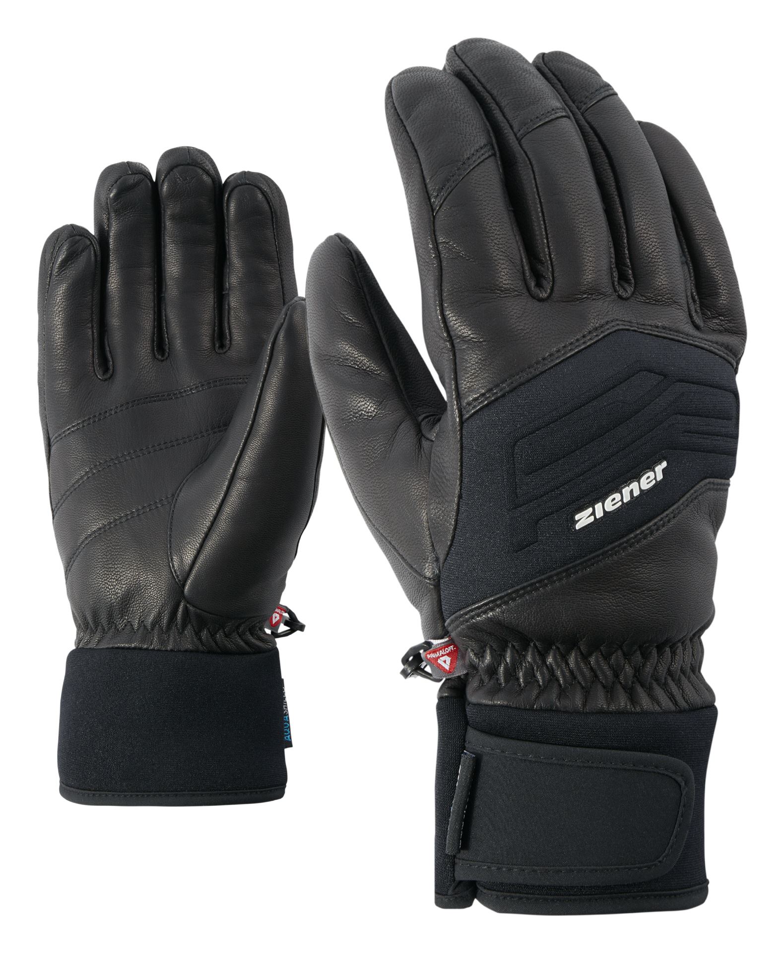 Die klassischen Herren-Skihandschuhe GOWON AS PR für den sportiven Skifahrer zeichnen sich durch einen hochwertigen Materialmix aus. Für optimalen Griff und Kraftübetragung auf den Skistock sorgt die weiche und sehr robuste Lederinnenhand, während die warme, weiche PrimaLoft Gold Wattierung auch an kalten Tagen angenehm warm hält. Die wasser- und winddichte ZIENER AQUASHIELD Membrane garantiert einen angenehmen Klimakomfort bei jedem Wetter. Das hochwertige Neoprenbündchen am Handgelenk schließt eng ab und sorgt für festen Halt. Enthält nichttextile Teile tierischen Ursprungs.